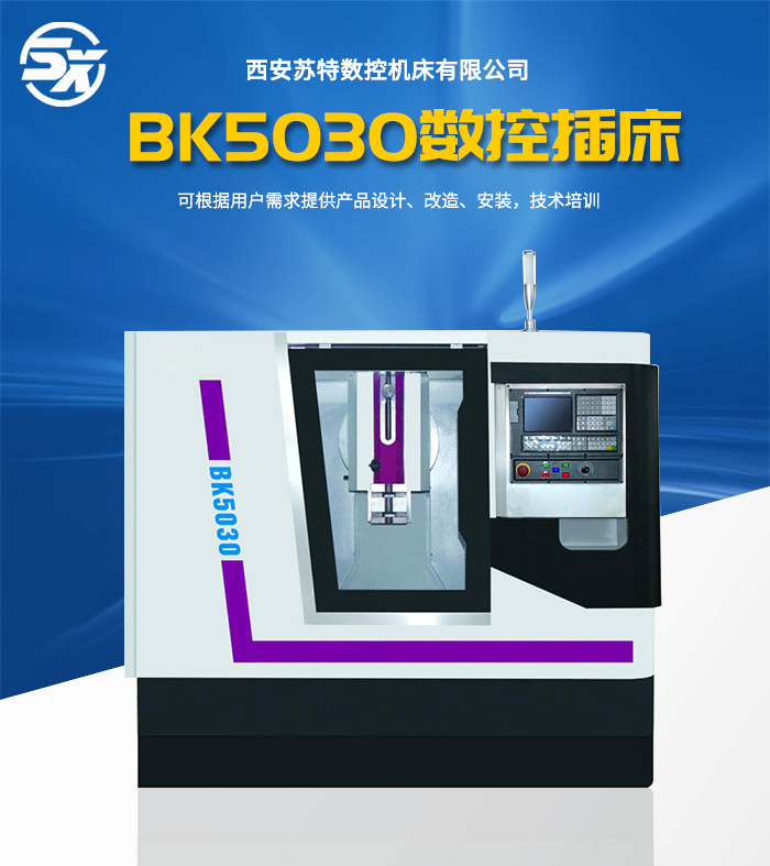 BK5030数控插床是本公司设计开发的新产品。本机床具有插削平面、成形面及键槽功能,是一款通过数字控制来实现插削的切削机床。主传动采用曲柄摇柄机构,由伺服电机通过减速实现大扭矩传动,X和Y向进给为伺服控制实现无级调速功能,X向滚珠丝杠与电机直联,Y向滚珠丝杠与电机通过同步带传送。